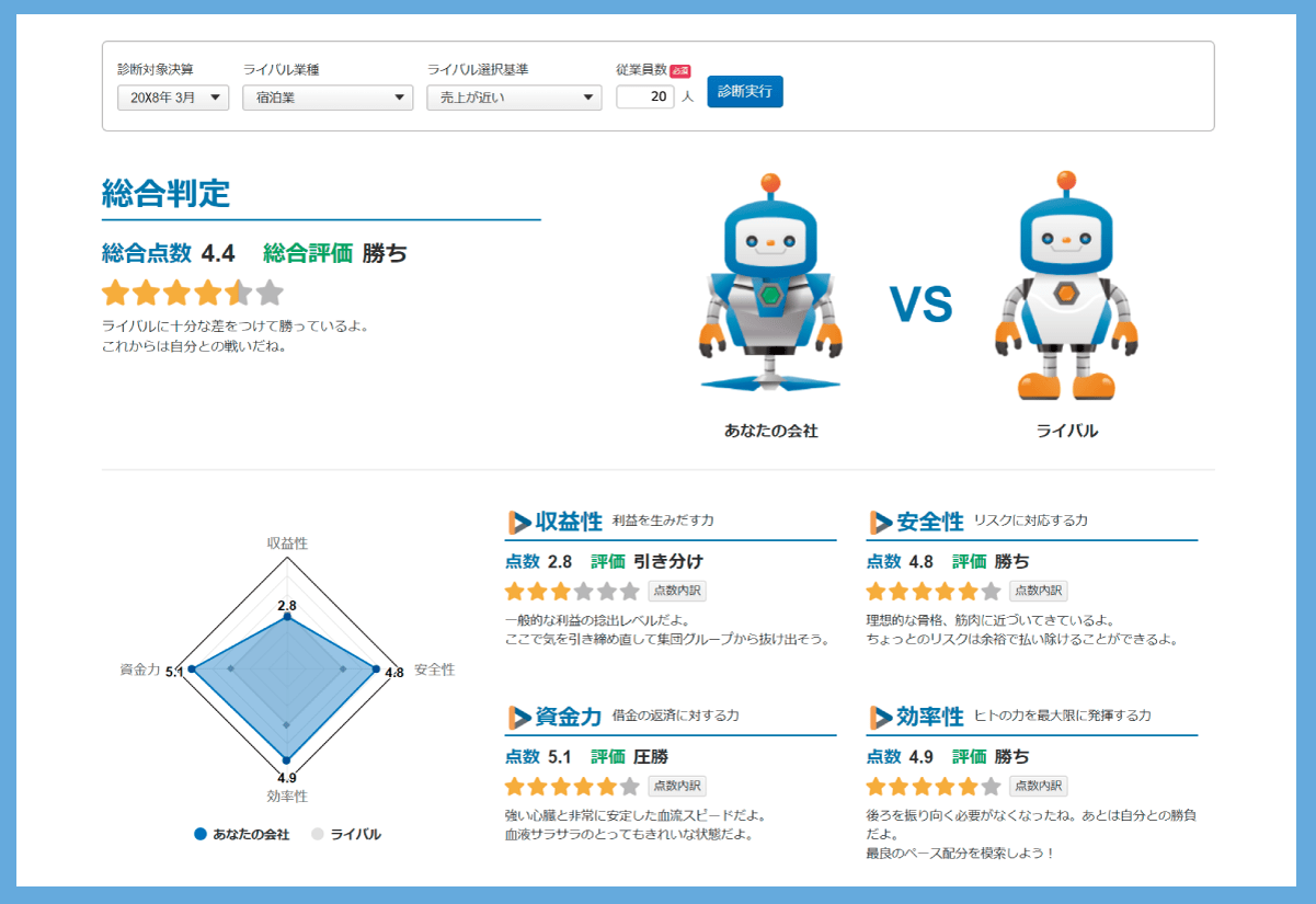中小企業庁が公表している業種別指標をベースに、ライバル業種と自社の決算数値を比較して、収益性・安全性・資金力・効率性など自社の「強み・弱み」を診断できます。
