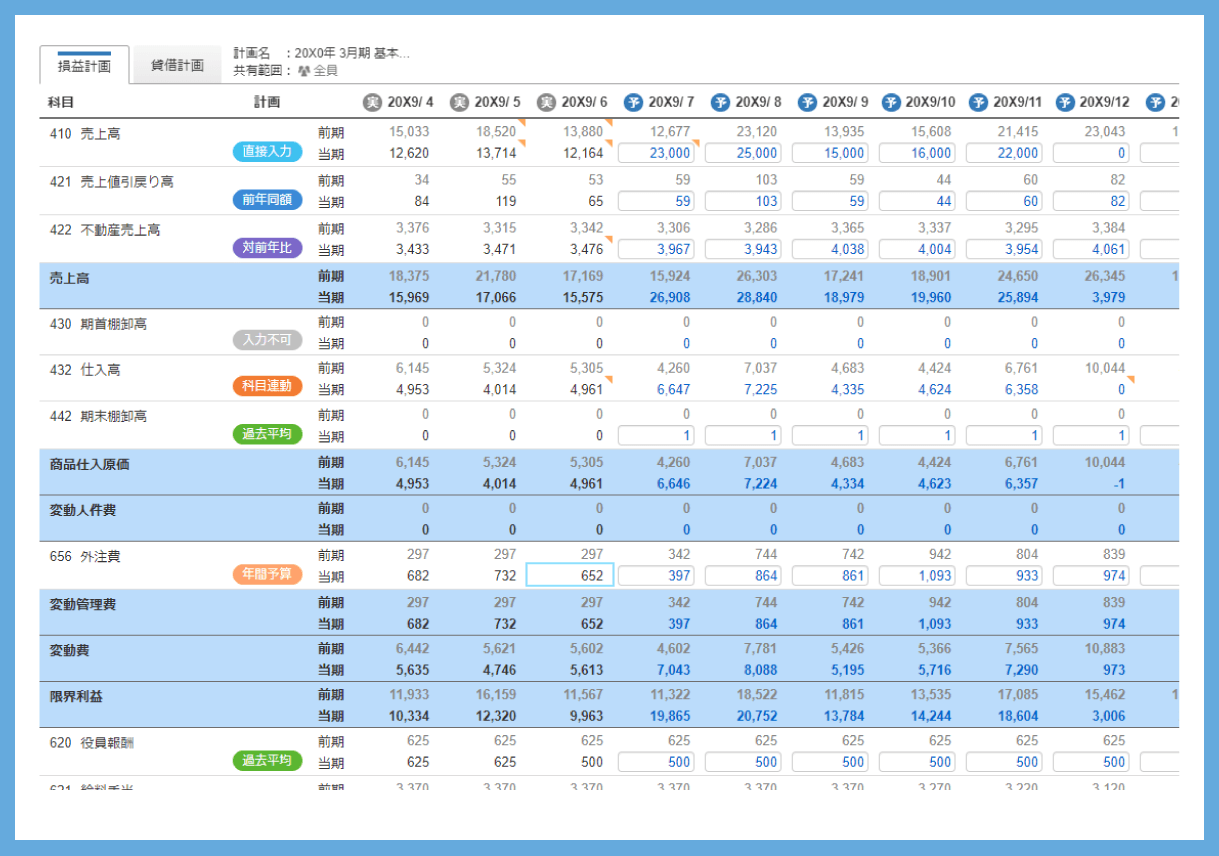 ビジュアルレポートで予実対比(計画+実績 or 前期+計画+実績)ができます。